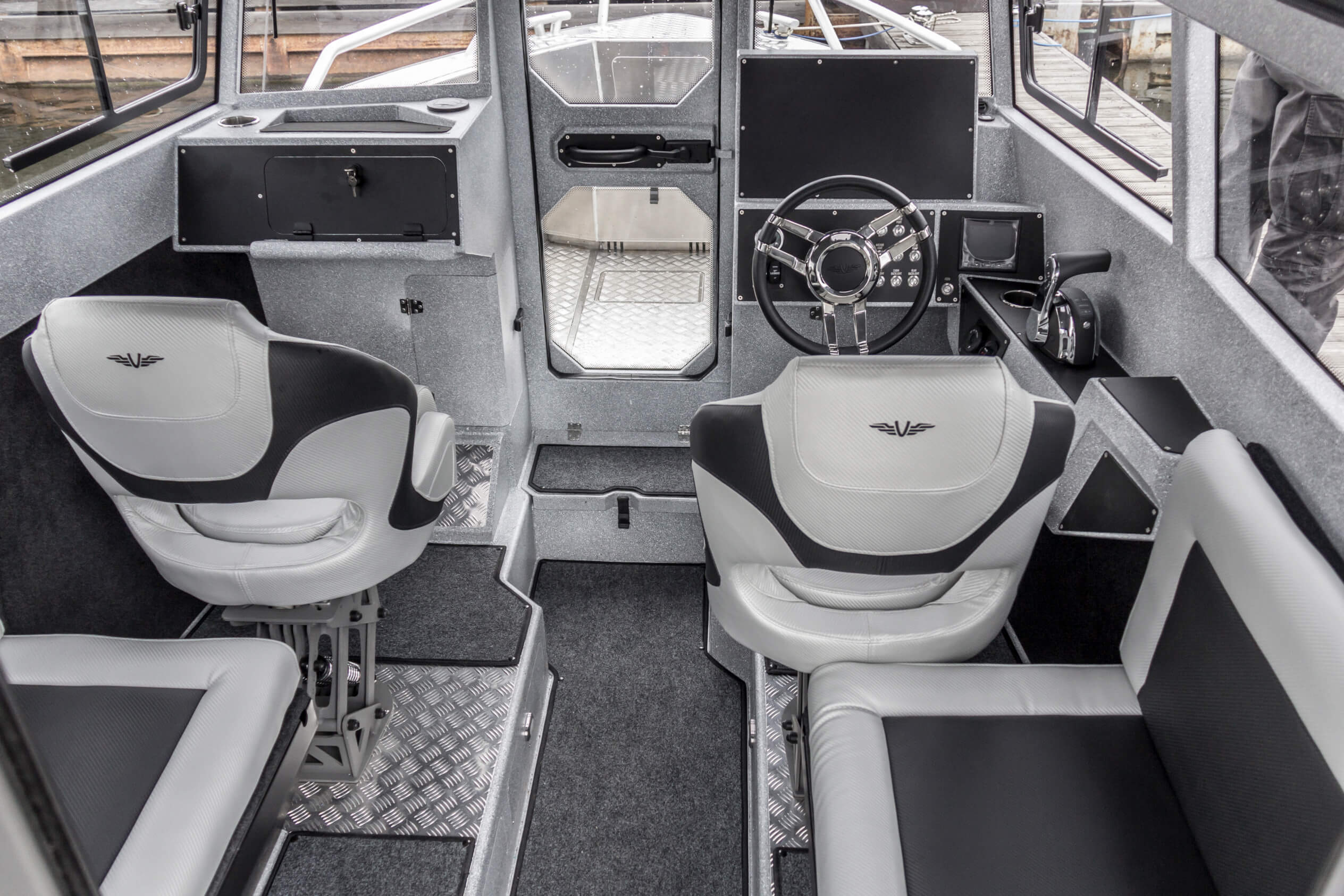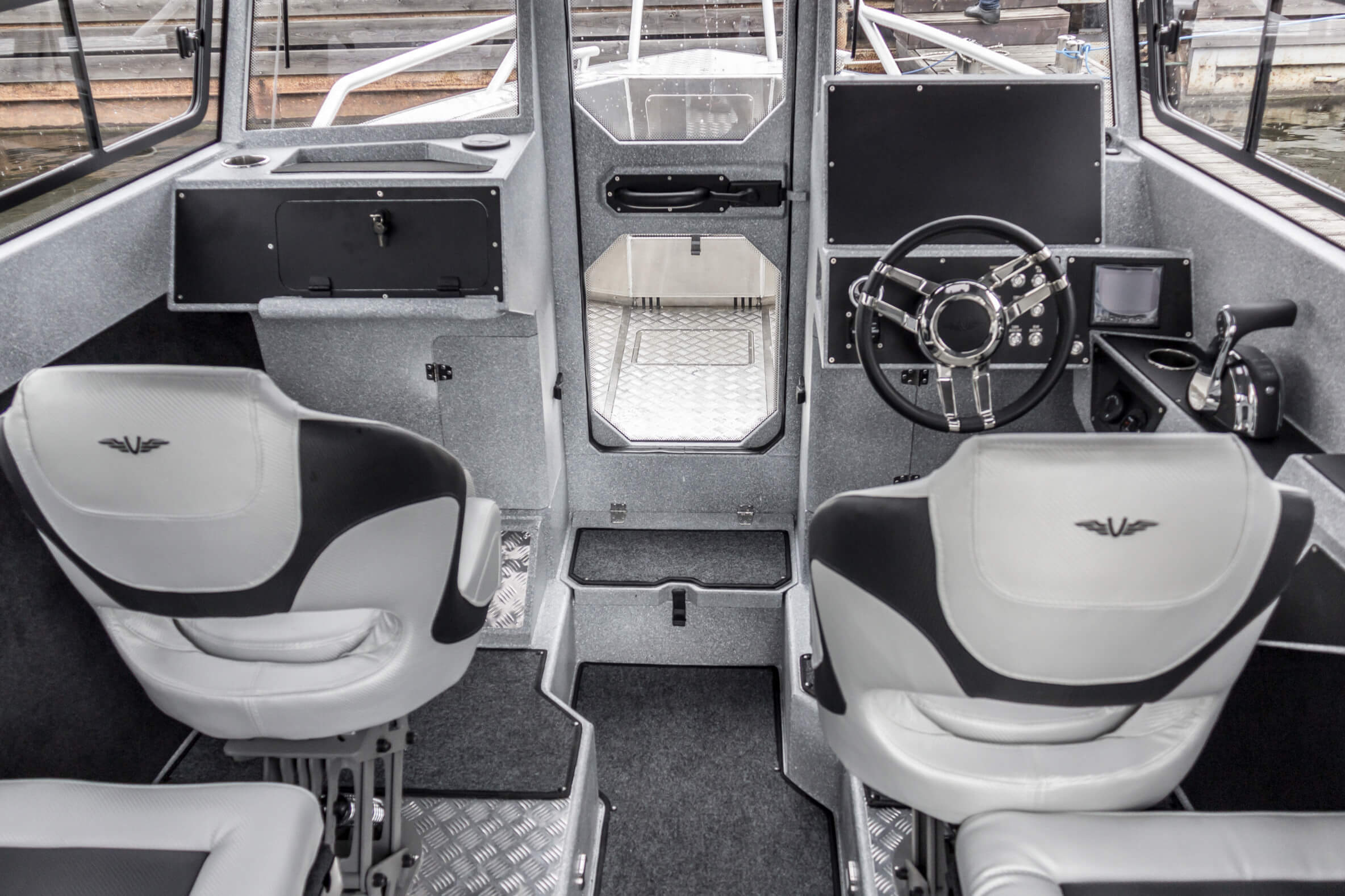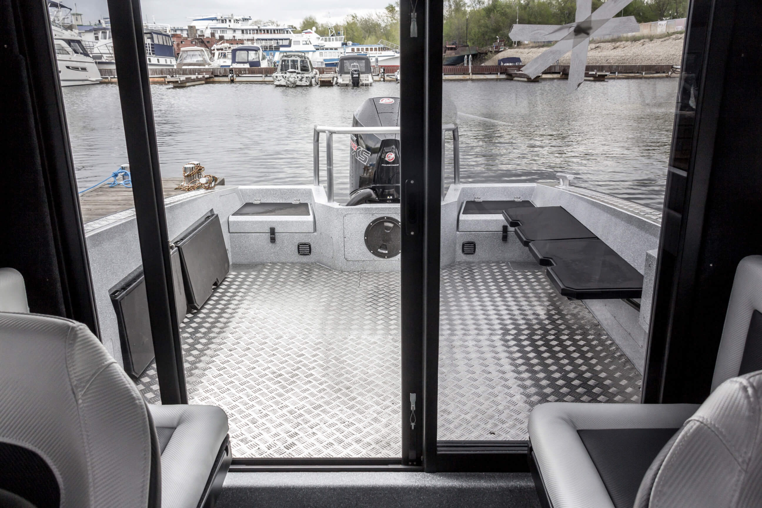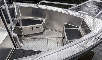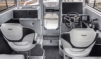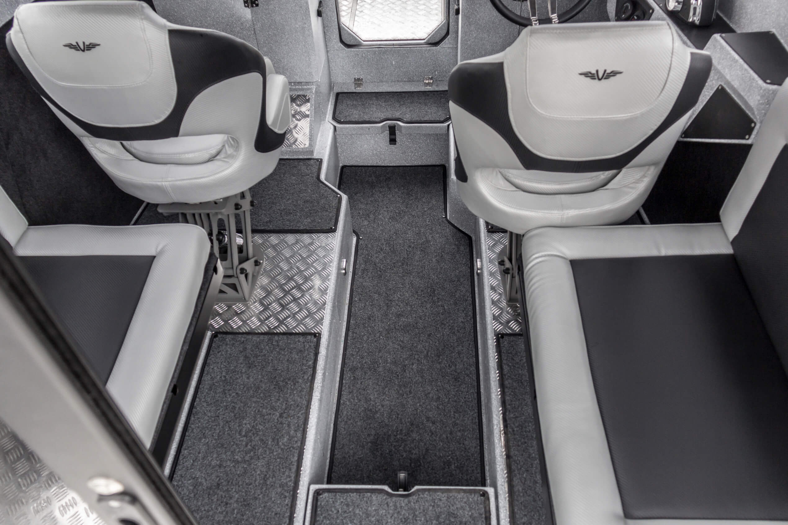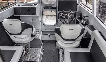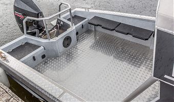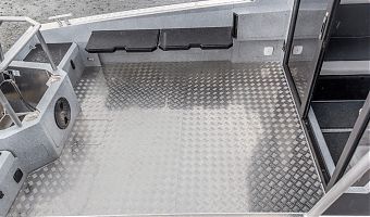 Ковролин на лодках профессиональной серии FishPro должен быть не только устойчивым к влажности и ультрафиолету, но и иметь специальную структуру, не позволяющую острым рыболовным крючкам цепляться за него.