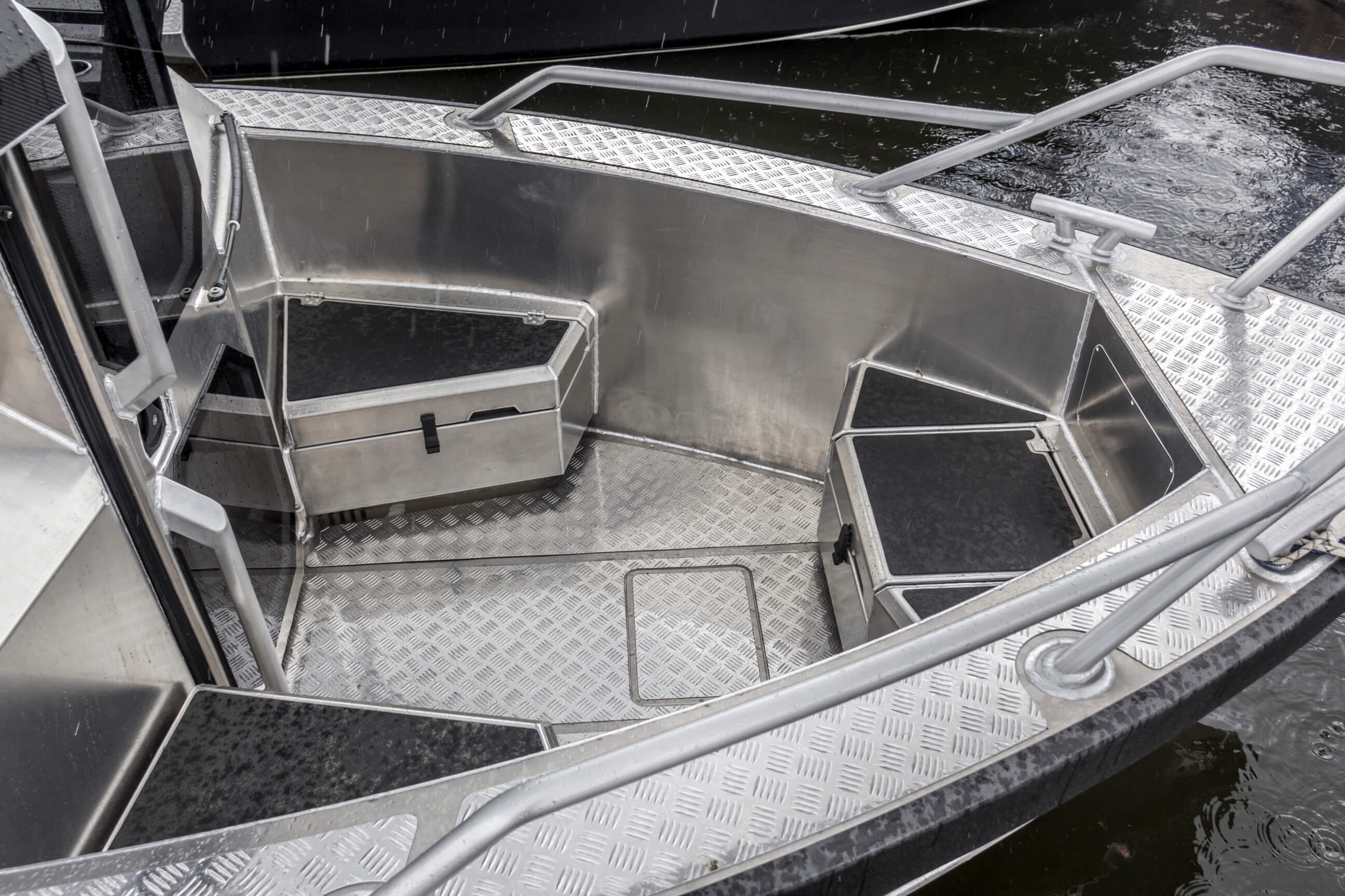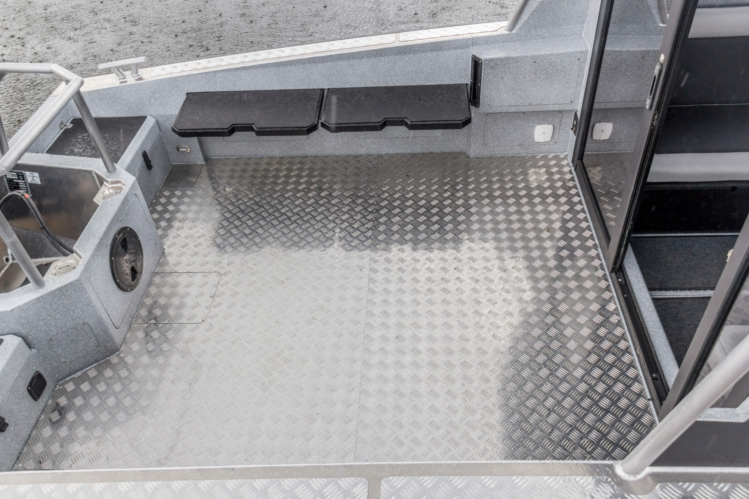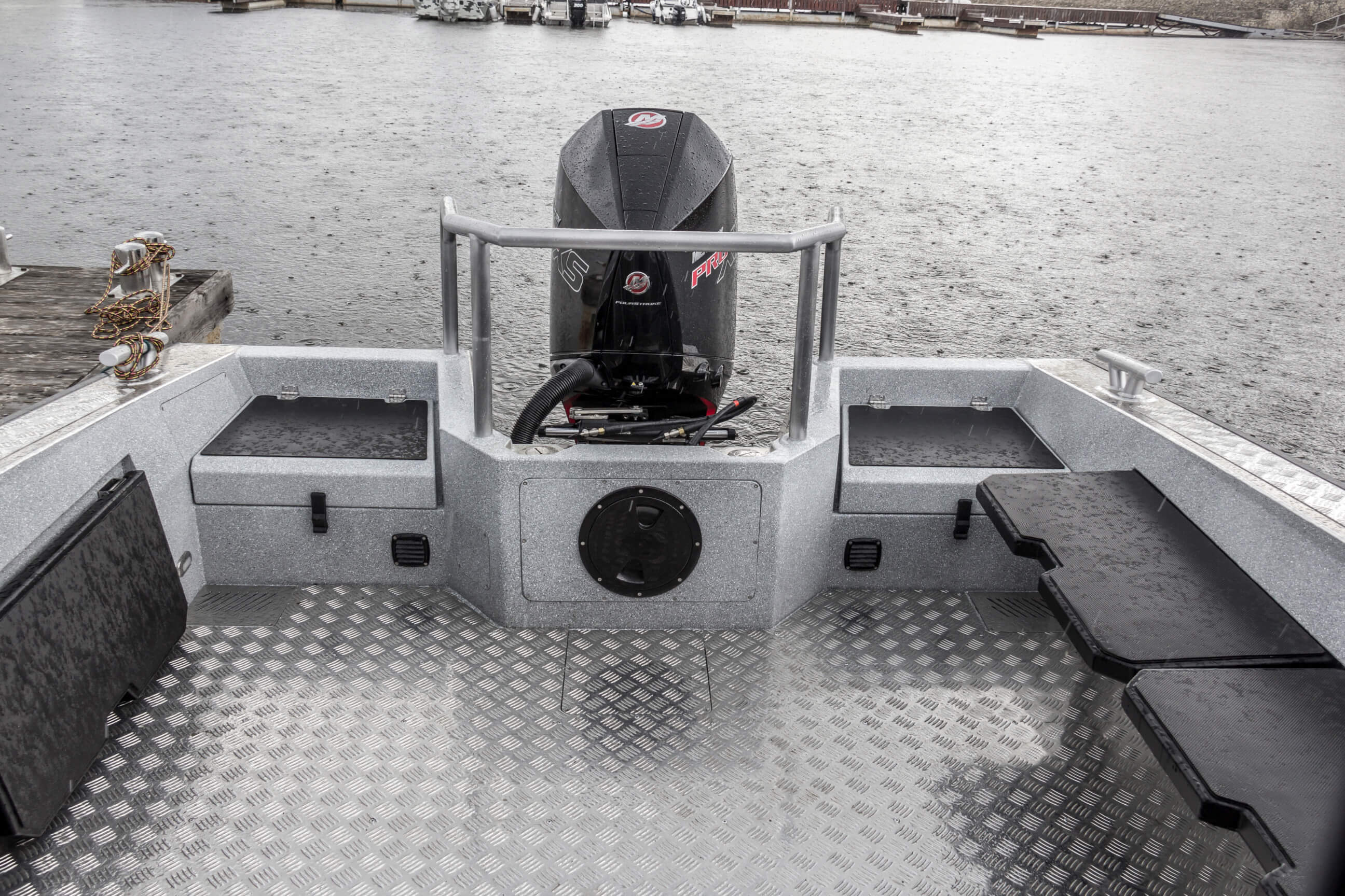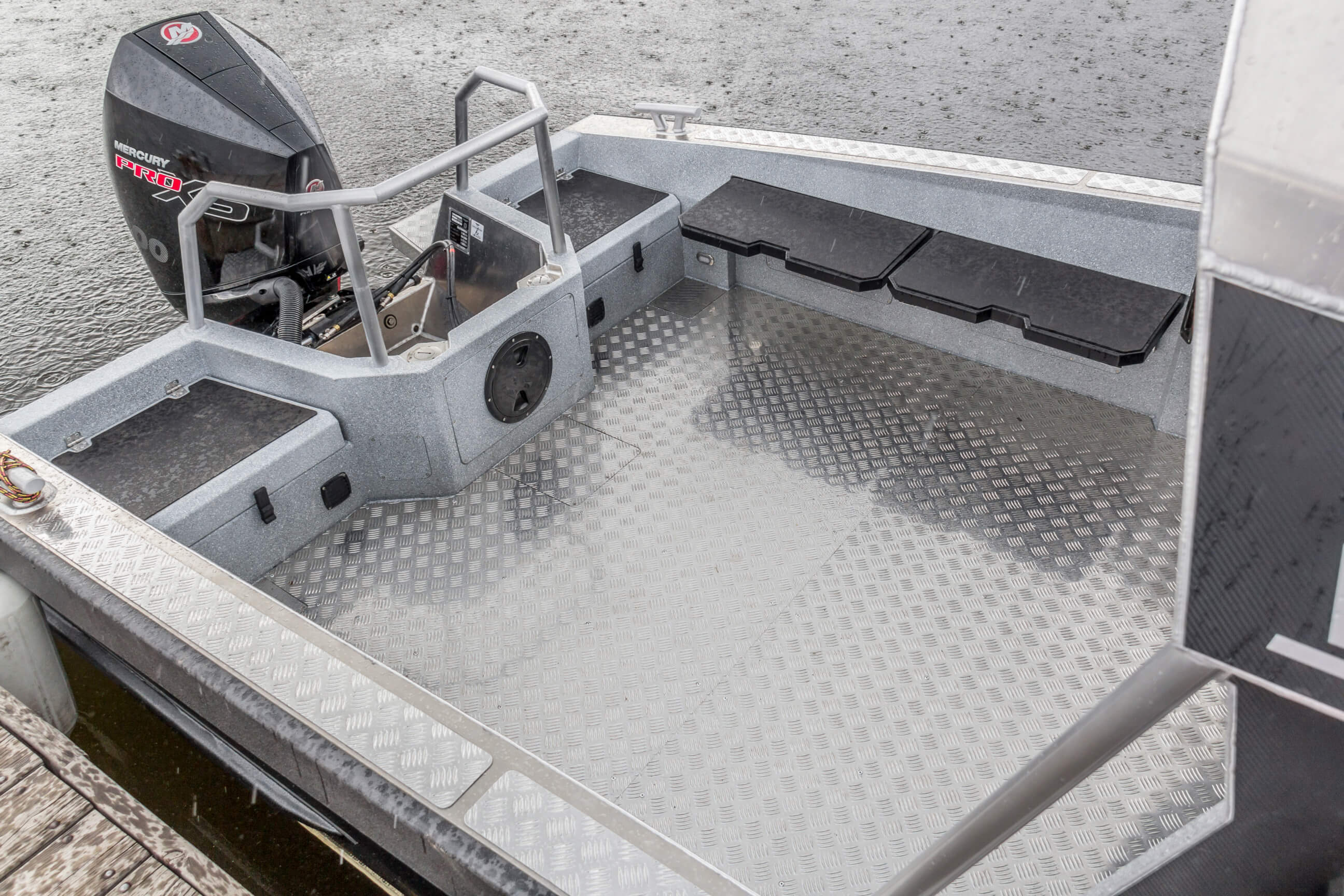 Ковролин на лодках профессиональной серии FishPro должен быть не только устойчивым к влажности и ультрафиолету, но и иметь специальную структуру, не позволяющую острым рыболовным крючкам цепляться за него.
