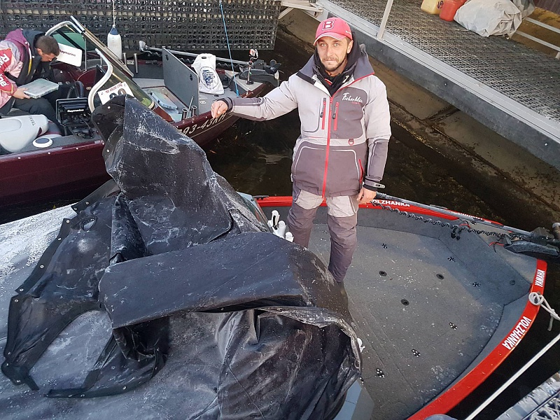 На собрании бот-кэпов вытаскиваю 3 стартовый номер, уходим вместе с экипажем Рытов – Кузьмичев. Морозец, туман. Легкий ветерок обещают на тур. Оделись тепло, зимние костюмы пришлись к месту и времени. Четкий план, который накануне ночью мы расписали на листке бумаги придавал нам уверенности чтобы, как нам казалось нериально не поймать 5 рыб с 15 точек, что оказалось не так. Главный судья дает старт 8.03 мы мчим на первую точку! Это глубокая протока, с небольшим течением, твердыми закоряженными буграми на дне. Это то место где была поймана щука на 8 кг и была постановка на судака. С напарником сразу договорились что не будем паниковать даже если после истечении времени половины тура у нас в лайвеле не будет ни одной рыбки, согласились друг с другом и начали работать по плану. Так вот, эта закоряженная протока не дала нам даже поклевки, что неудивительно так как рыбу мы там ловили после обеда и была активность, плюс температура воды упала почти на 2 градуса, рыба стала в ступор. Двигаемся дальше 15 минут ниже по течению до всеми известной «Щучей тропы», там у нас одна постановка ловим 15 минут но поклевок нет, перемещаемся до закоряженой косы и рядом с ней у нас была точка «Три заброса» как раз по пути перемещения, чтобы не возвращаться заезжаем. И вот с подхода ловим первую рыбу и самую крупную за два дня 3600гр щука, время 9.30 минут, все идет по плану, самое интересное что эта точка в три заброса на тренировке не дала нам рыбы, были невнятные поклевки но место очень понравилось. Пока все хорошо, еще 10 мест есть, тем более главный расчет и уверенность была на Паньшенский район в который мы должны прибыть в правильное время, играем дальше. Пробиваем находящийся рядом щучий свал, ноль, время 10.32 минуты мы на следующей отдельно лежащей коряжке на ступеньке резкого свала, трешку ловили там на тренировках, но снова ноль, тишина, мертвая. Перемещаемся в сторону старта на постановку «Структура», высокие бугры с ракушкой, которая забрала не мало приманок , точка с расчетом на хорошую щуку, ставлю слаг, ловлю с подбросом и как часто это бывает садиться рыба без поклевки и довольно таки хорошего размера, не форсирую, аккуратно вываживаю ее и в момент когда необходимо было ослабить фрикцион она сваливается, без слабины, просто тупо сваливается!!!! По прикидкам минимум 6ка была, не расстроились, но очень не приятно было, у меня лично таких глупых сходов никогда не было, фантастика. Когда то все бывает в первый раз)) Идем в сторону Паньшина, не доходя , выход с Липового постановка на резком, опять же закоряженном свале, облавливает по разному, напарник на снос против течения, я апстримом, только забросил от души и вижу как Володя что то тащит. Спрашиваю : «Рыба?» Отвечает : « Нет коряга» ну коряга, коряга, ладно продолжаю проводку и посматриваю на него как он форсирует её, в метрах двух от поверхности вижу белое брюхо, какая нафик коряга, бросаю палку и закидываем ее в подсак! Рыба не дернулась у него не разу, с чем это связанно не понятно, в лайвеле чувствовала себя отлично. И вот первая постановка в Паньшино, точка Судак окунь, в этом месте проходило русло Волги и из него вытекал ручей. На ходе в него по правой бровке была правильная коряжка на глубине 7-8 метров, время 11.50 ловим, но поклевок нет, через десять минут рыба начинает жрать и в течении 10 минут Володя ловит 4 судака. Вот мы 